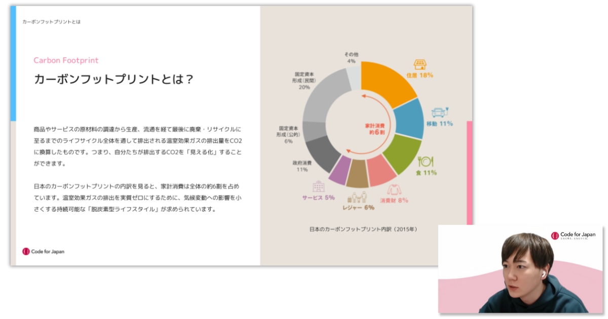 エンジニアのあっきーからは、このプロジェクトが取り組む社会課題である気候変動問題と、世界の平均気温上昇を抑えるために、暮らしの中で私たち一人ひとりが排出するCO2を「見える化」し、意識的に減らしていけるような、持続可能な「脱炭素型ライフスタイル」の必要性をお話ししました。