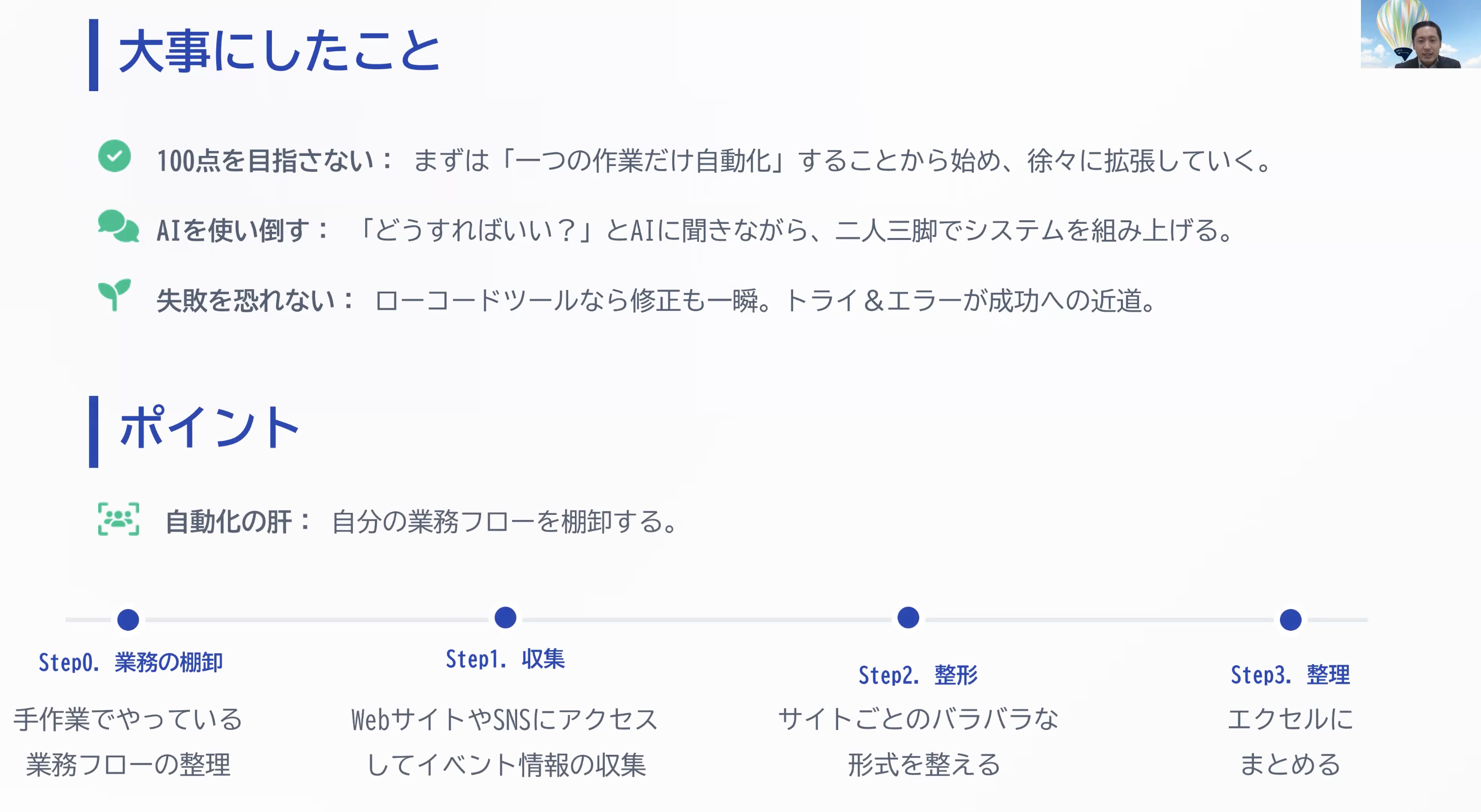 振り返りとして山岡さんが大切にしたことは3つ。100点を目指さない、AIを使い倒す、失敗を恐れない。この姿勢が、非エンジニアの職員が業務自動化を実現させた鍵だったようです。現在は人事課の通勤距離確認業務(数百件)の自動化にも取り組みを広げています。