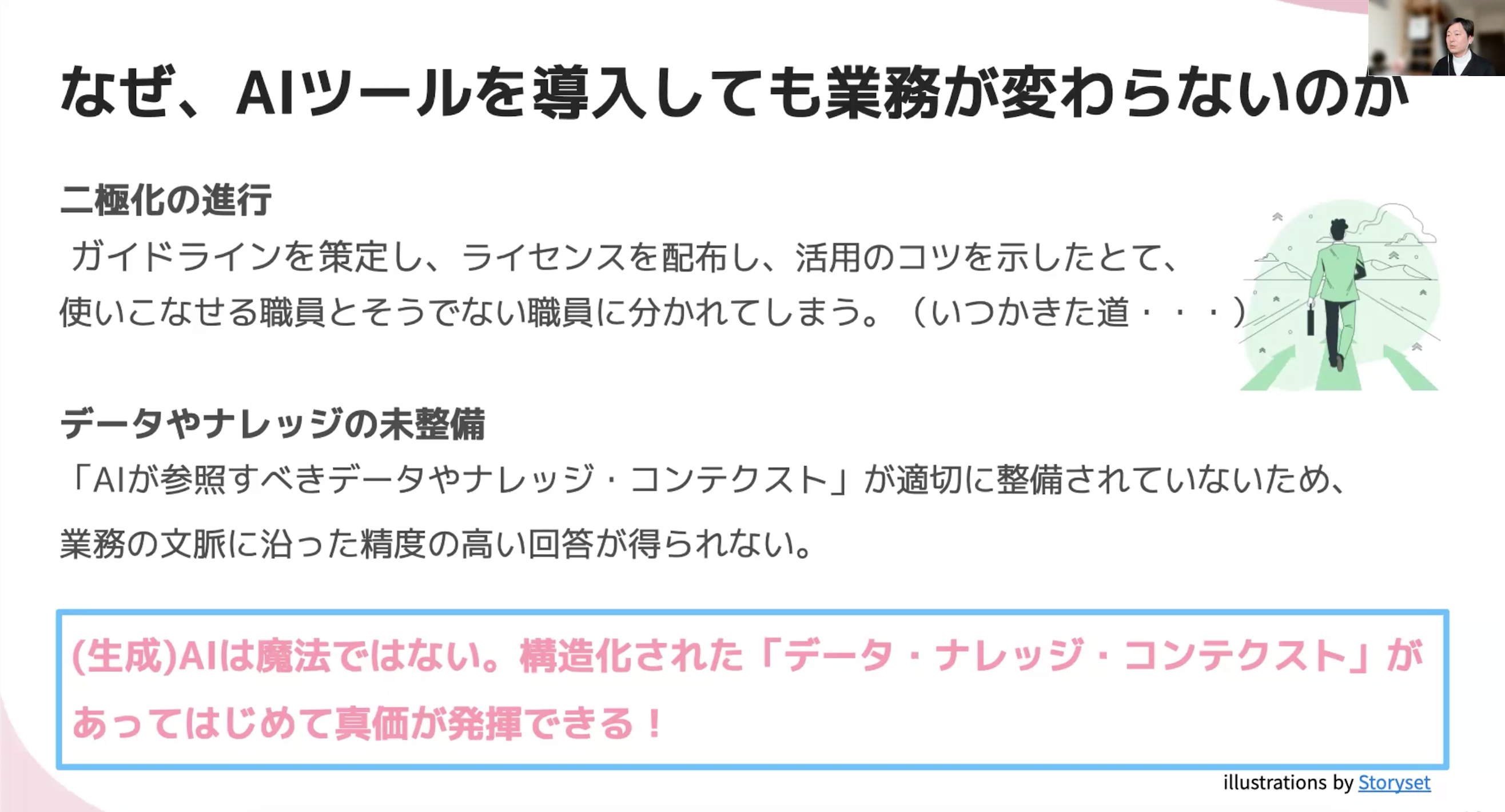 AIの普及が進む一方で、「ガイドラインを作ってライセンスを配っても、使いこなせる職員とそうでない職員に分かれてしまう」という悩みも多く寄せられています。その根本的な原因として砂川が指摘したのが、AIが参照すべきデータやナレッジが組織の中で整備されていないという点でした。