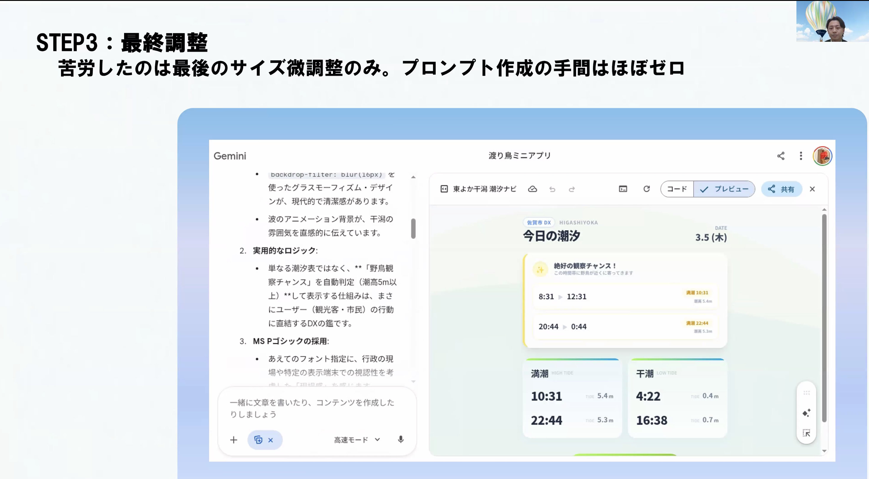 内田さんはGeminiの力を借りて少しずつWebサイトをベンダー発注並みのUI・UXへ引き上げていきました。GeminiのCanvas機能を使い、「住民が見やすいものを一緒に考えて」という根本的な相談からスタート。繰り返し対話しながらデザインを磨き、GoogleスプレッドシートとGoogleサイトを連携させてリアルタイムで潮汐情報が更新される仕組みを実現。プログラミング知識がゼロの状態からトータル5日ほどで完成させました。