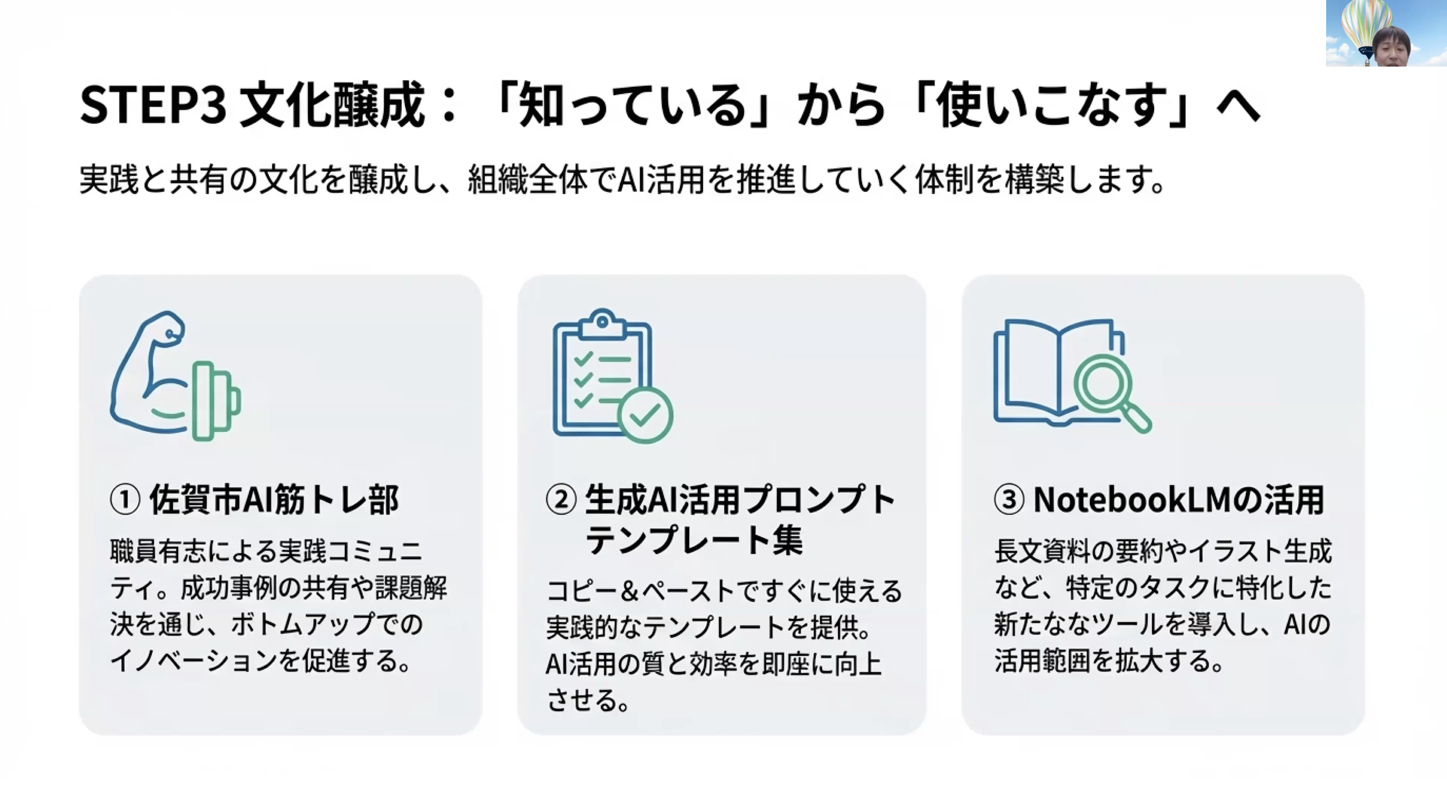 また、庁内での横展開を加速するために、任意の集まりとしての「生成AI筋トレ部」の発足や、プロンプトテンプレート集の整備、Google AI(GeminiやNotebookLMなど)の試験導入も進めています。
